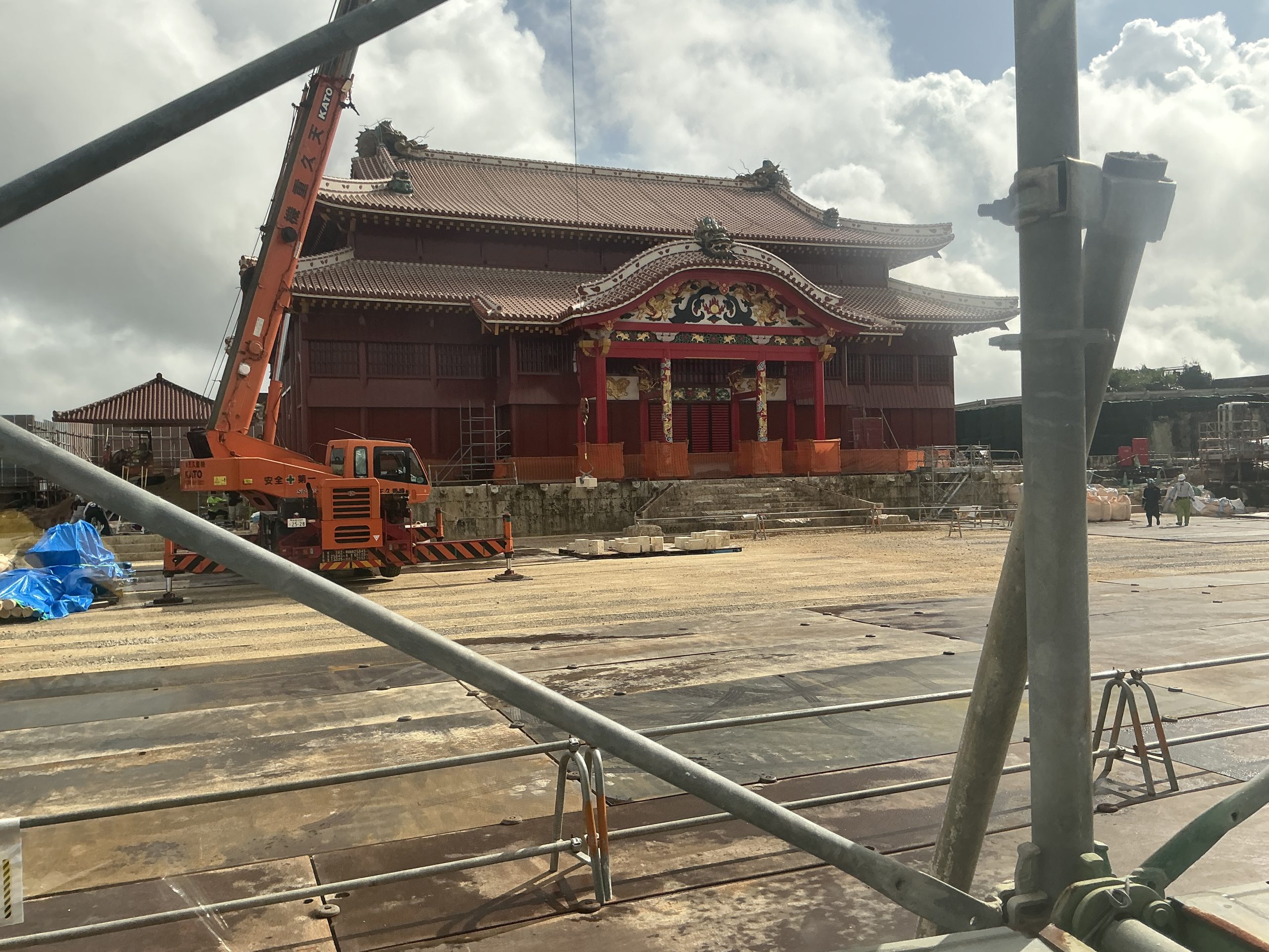 最終日は2026年秋の正殿完成に向け、着実に復元が進む首里城からお届けします。雨で集合写真の撮影が危ぶまれましたが、無事撮影をすませてガイドさんの話を聞く生徒たち。完成が楽しみです。