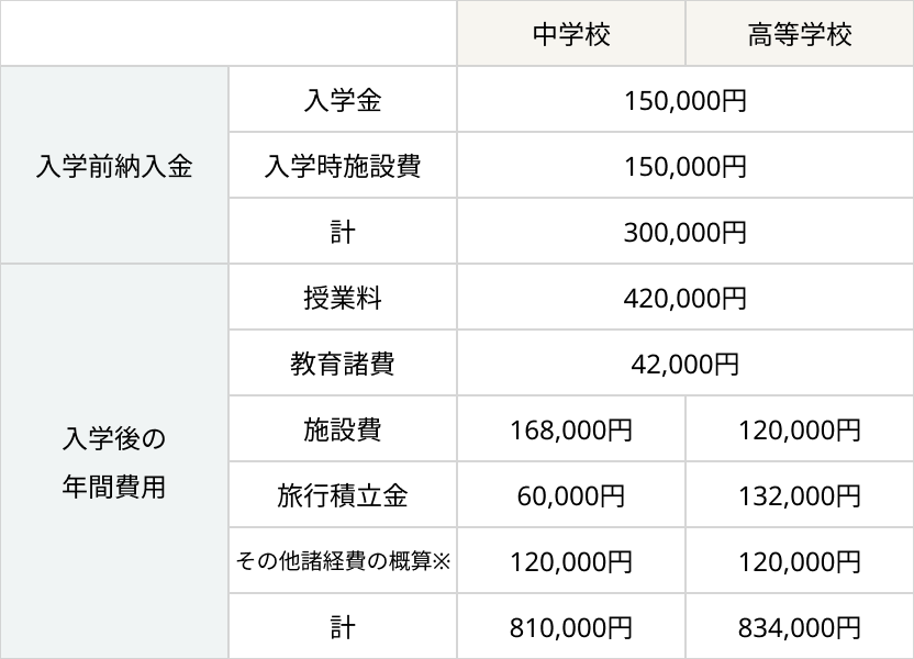 ※その他諸経費は、副教材、模試、PTA会費等の他に、希望者の講習代や文化祭クラスTシャツなどを支払う預かり金という形で120,000円(残金は年度末に返金)計上しております。