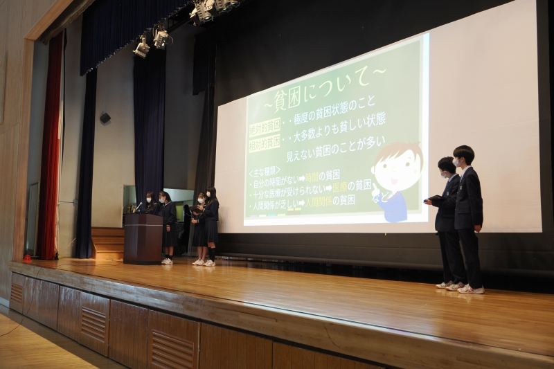 12月20日(水)、体育館で中学校の探求学習発表会を実施しました。中1、2、3の各学年の探求学習発表会をまず実施し、この日は、各学年で選ばれた代表チーム6チームが中学校全体で発表しました。