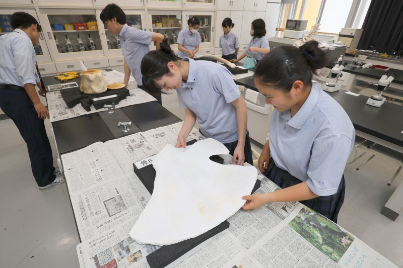 探究生物講座で持ち込まれたツチクジラの本物の骨はやはり大きかったですね。千葉大学教育学部の野村純教授による出張授業は「生きるとは…」というテーマでした。野村教授は生徒が書いた感想全員分にコメントを書いて後日送り届けてくださいました。