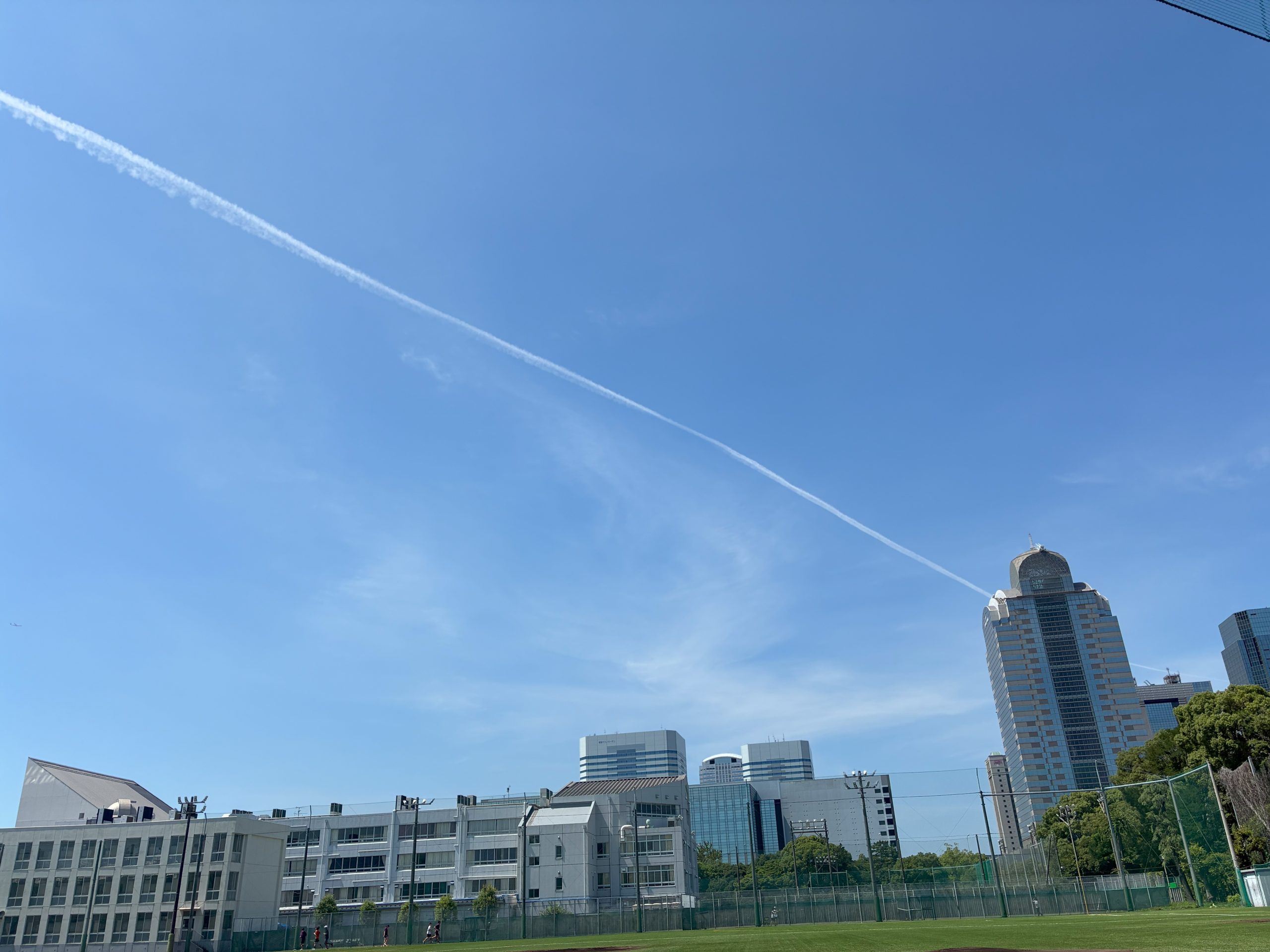 未来につながるグラウンド上空の飛行機雲