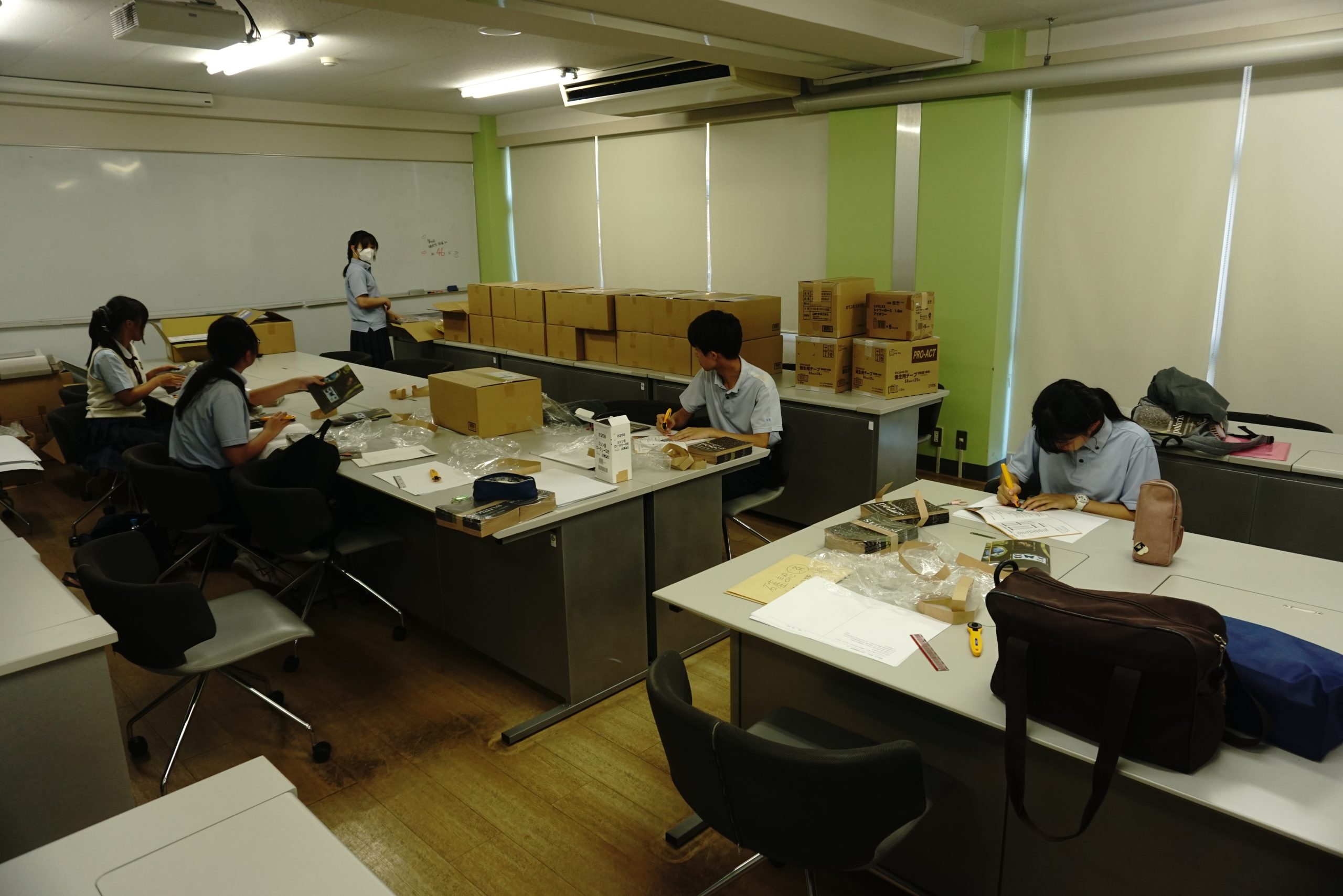 照りつけるような暑さの中、教室に集まり準備を進める生徒たちがいます。